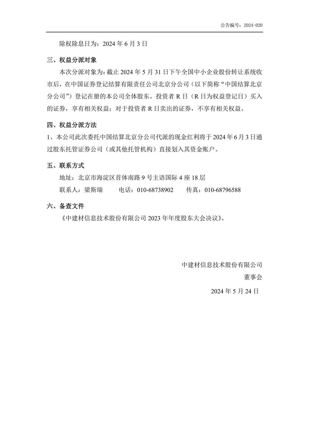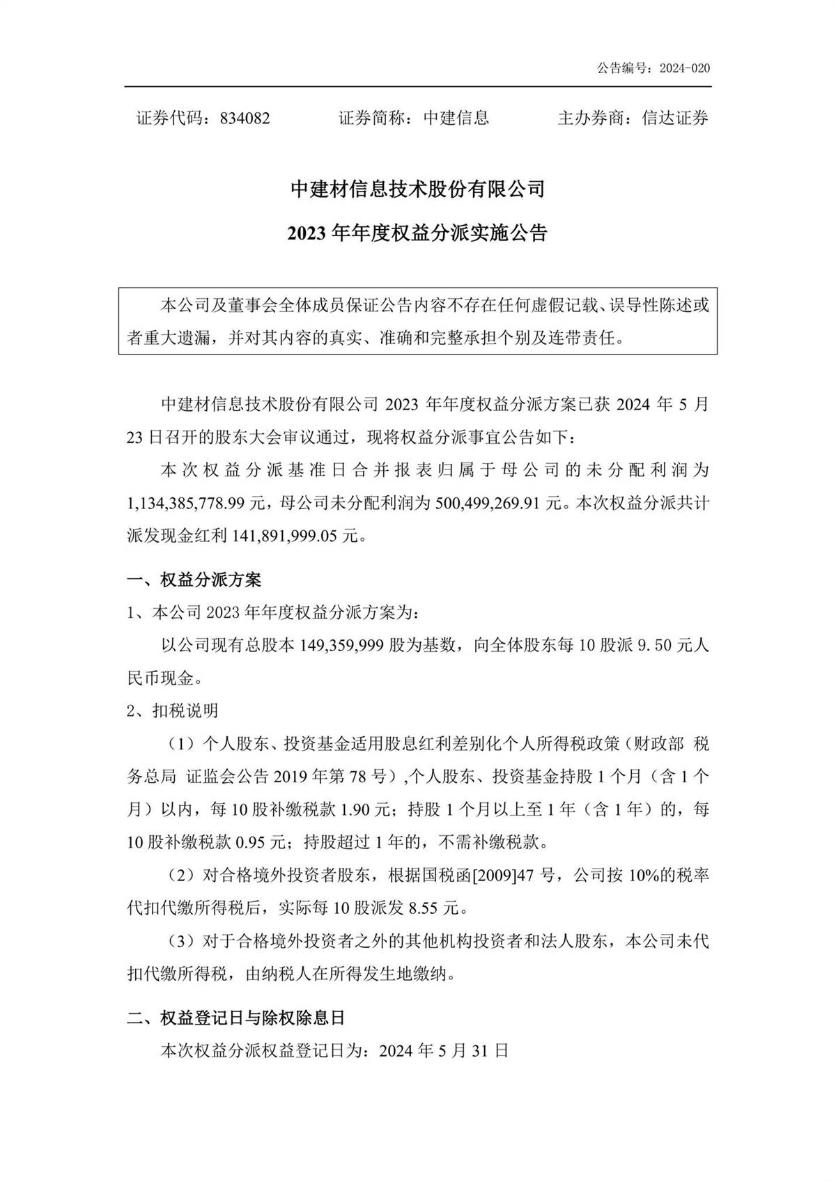 中建信息2023年年度權(quán)益分派實施公告